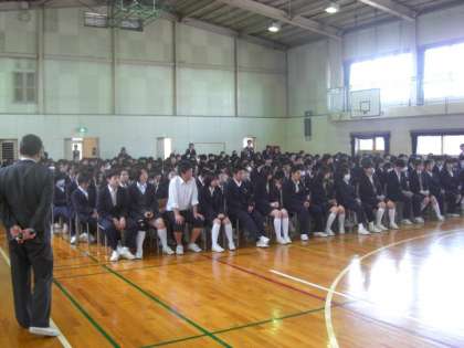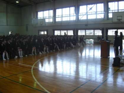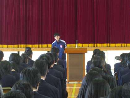 卒業間近の3年生と福祉学習をすすめている2年生を対象に、卒業記念講演会が行われました。講師は、「ブラインドサッカー日本代表メンバー」の黒田智成氏です。ブラインドサッカーを通して、困難にくじけず、夢をもつことの大切さについて話をしていただきました。生徒たちも、熱心に耳を傾けていました。