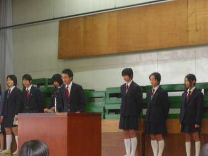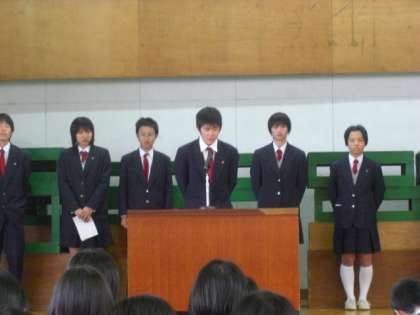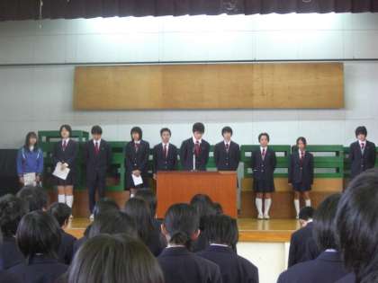生徒会朝礼では、各委員長より、連絡がありました。原稿を用意せず、生徒たちの方を見て語りかけるように発表する人がいました。約半年が過ぎ、発表も慣れてきたようです。