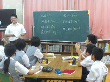 佐藤優先生が、図書室で、1人称、2人称、3人称の主語の使い分けの練習をしています。佐藤優先生は、毎回、手を変え、品を変え、生徒の興味関心を高めて授業に臨んでいます。生徒の表情を見れば、それがすぐに分かります。