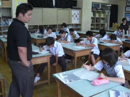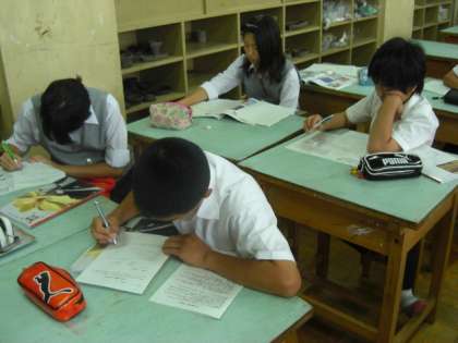 美術の長友先生が、出来上がった作品についての自己評価に取り組んでいます。自分の課題に気づいた生徒たちは、さらなる目標に向かって取り組むようになります。