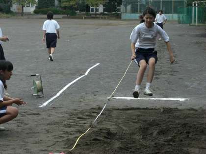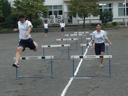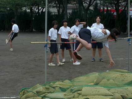 高跳び、ハードル、幅跳びをやっています。生徒たちは、積極的に取り組んでいます。高跳びでは、バーをクリアするたびに、歓声が上がっていました。