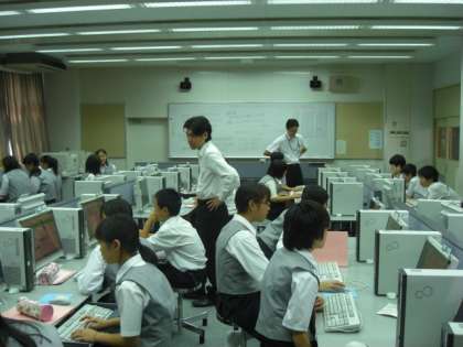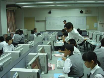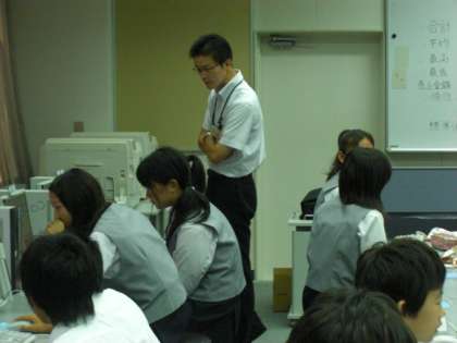パソコンで、カレーについての調べ学習を行っています。具財や調理方法や健康に留意したバランスの取れた食事について調べています。30日には、フィールドワークに出かけ、自分たちで実際に調理します。担当の市来原先生と小林高洋先生も、生徒たちの間を回って、生徒の活動を見守っていました。