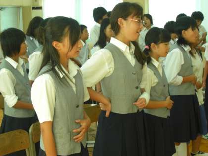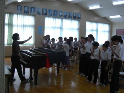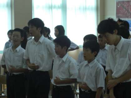 発声練習をしています。担当の門倉先生が、生徒たちの声が少しでも出るように、いろいろな方法で声を出させています。