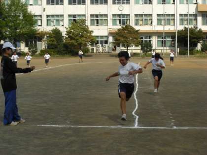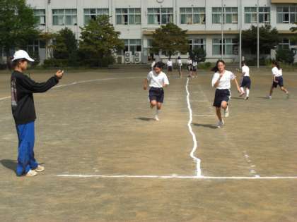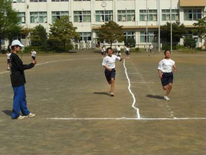 スターターの合図とともに、50m走を全力で走っています。高橋先生が、ゴール付近でタイムを測定しながら、生徒たちに声をかけていました。