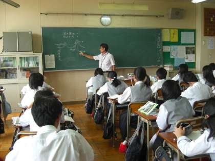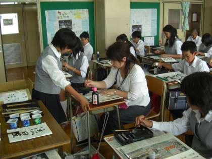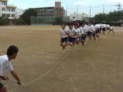 1年生は、午前中授業、午後音楽鑑賞教室に出かけます。3校時の1,2組は、体育の授業でした。生徒は、体育大会に向けて、今日も大縄の練習に励んでいました。3組は、書写の授業でした。書写指導の中村先生(学習支援ボランティア)が、生徒のために氏名のお手本を書いていました。4組は社会の授業でした。山本先生が、黒板を使って、「山形・米沢盆地の風が弱く、雪が少ない理由」を分かりやすく説明していました。1年生は、午後、東京都交響楽団の演奏を聴きに八王子市民会館に出かけます。