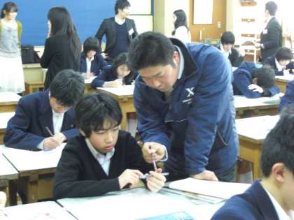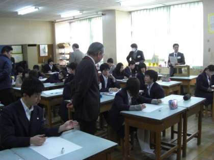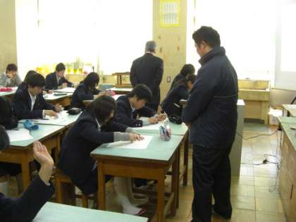 今年度、東京教師道場で研修している長友先生が研究授業を行いました。生徒たちは、大勢の先生方に囲まれて、少し緊張していました。