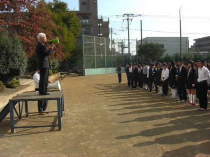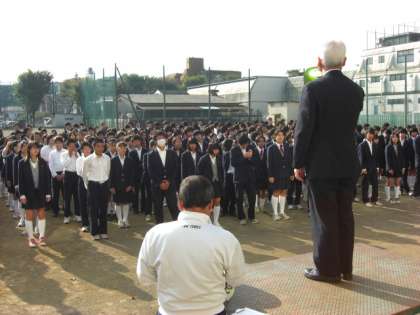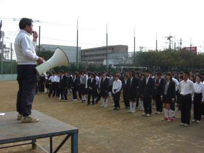 インフルエンザの影響で、全校朝礼を急遽、校庭で行いました。校長先生から大切な心構え、私からインフルエンザの予防、保坂先生から最近の生活についての話を聞きました。現在、健康な生徒も感染には十分に気をつけてください。