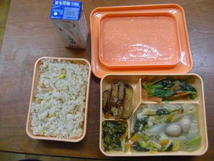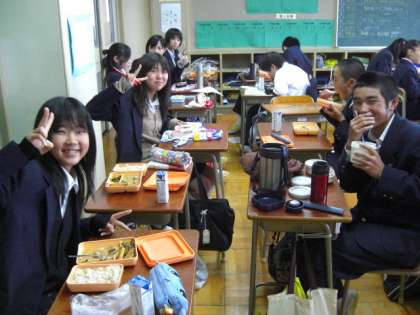 楽しそうに給食を食べています。男子も女子も笑顔が素敵です。本日のメニューは、エビチャーハン、いろどりうま煮、野菜のごまおかか、ナッツポテト、茎わかめのしょうが炒めでした。個人的には、茎わかめのしょうが炒めに感動しました。