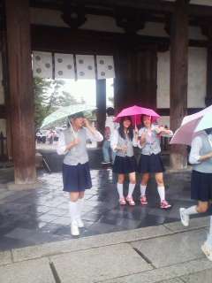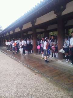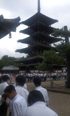 一行は予定通り法隆寺に到着しました。現在、世界最古の木造建築物に圧倒されていることでしょう。雨が降ったりやんだりと傘を離せないようです。