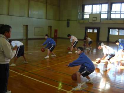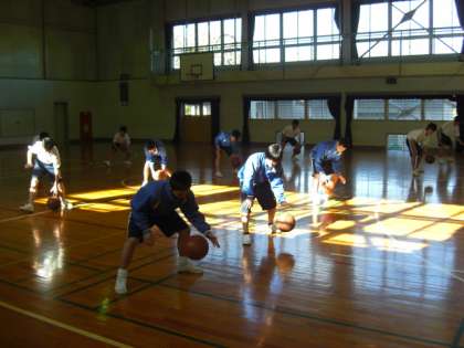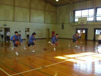 バスケットボールを使ってドリブルの練習をしています。保坂先生の合図で、体の向きを素早く変えます。ドリブルをするのにも、基本的な練習があるようです。何でもそうですが、基本をしっかり身に付けて、応用力を伸ばすのですね。