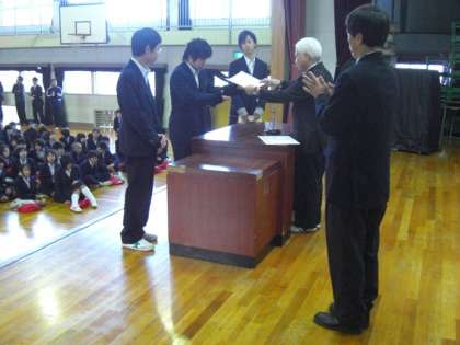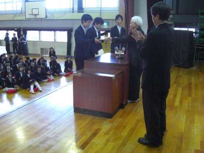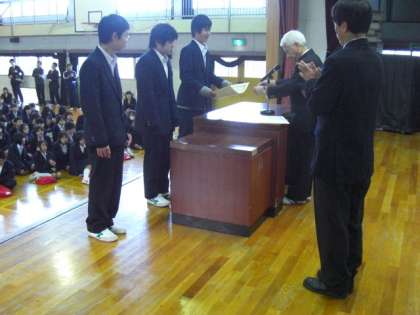 全校朝礼後、校長先生より、税の作文コンクール入選した岩永卓土くん(会長賞)、町田和成くん(優秀賞)、織田武優くん(優秀賞)が、校長先生より表彰してもらいました。心より、おめでとうございます。