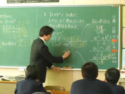 小林高洋先生は、3年目の先生ですが、細かいところまで気を遣いながら授業を進めています。板書の丁寧さはもちろんのこと、立つ位置や色チョークの使い方にも配慮しています。先日、夕方の遅い時間に、浅川中学校に行って数学授業の自主研修に参加してきました。一見クールに見えますが、じつは生徒たちのことを考える熱い先生なのです。