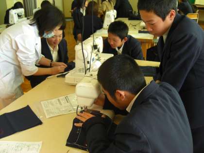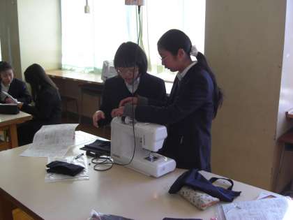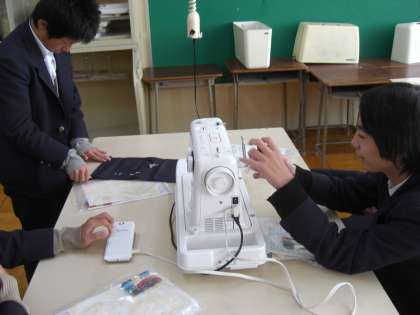 布地を使って、自分の好きな小物(ブックカバー、カバン、ティッシュペーパーなど)を作っています。市川先生の話では、2年生は圧倒的に「ブックカバー」を作る生徒が多いとのことです。それだけ、「本好き」な生徒が多いのです。