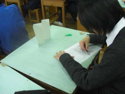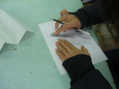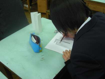 紙を折り曲げた立体のスケッチをしています。折り曲げたことにより、できた明暗や陰を鉛筆でかいていきます。最も明るいところは紙の色を残し、最も暗いところは斜線で色をつけていきます。鉛筆で引いた線を指でのばしている生徒もいました。工夫が感じられました。