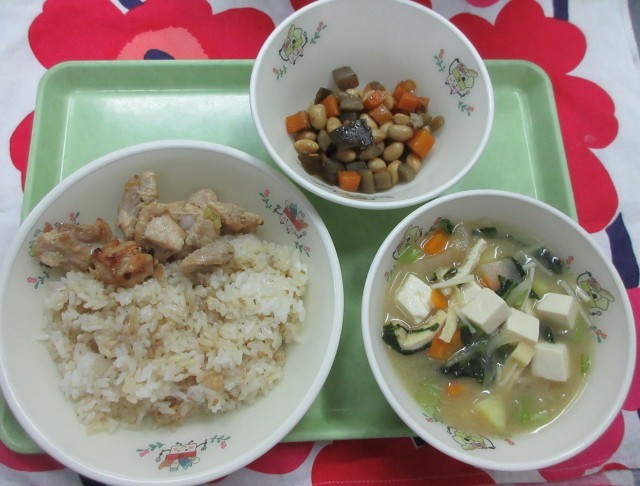 八王子しょうがごはん、とりにくのこうみやき、さつまいもじる、五目煮豆、牛乳です。八王子しょうがごはんのしょうがは、八王子の伝統野菜です。