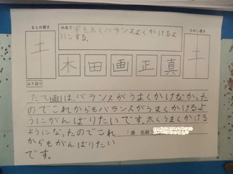 ただひたすら練習するのではなく、「たて画の筆づかいに気を付ける」というめあてをしっかり確認して、ワークシートも使って振り返りながら練習します。