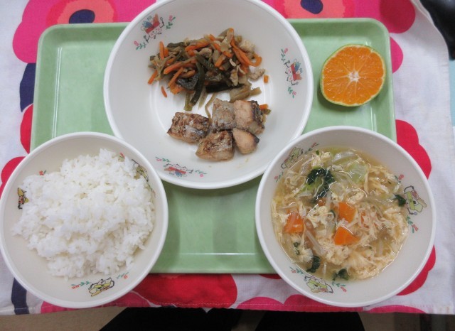 ごはん、さごちのごまみそやき、かきたまじる、くきわかめのとうざに、くだもの、牛乳です。