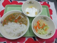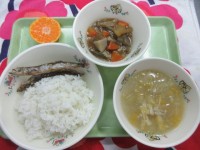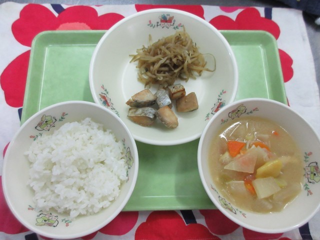 ごはん、さわらのゆうまやき、かぼちゃのすいとん、もやしのからしあえ、牛乳です。今日は、冬至です。かぼちゃですいとんを作りました。体が温まりました。