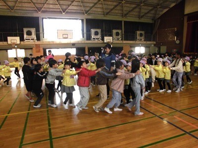 1年生の時に保育園との交流を行っていますが、その時の経験が実によく生かされ、あっという間に年長さんたちを引き込んでいきました。