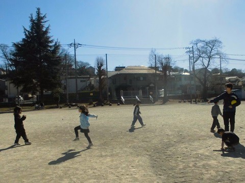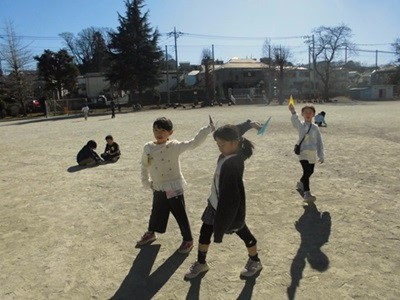1年生が「風で楽しむ」をテーマに、紙飛行機で遊んでいました。