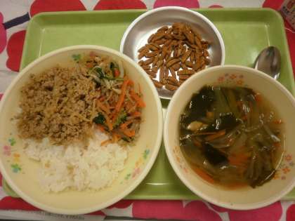 ビビンバ、新玉ねぎのスープ、黒糖ナッツ、牛乳です。