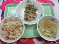 にんじんごはん、とりにくのこうみいため、かぼちゃのみそしる、もやしのからしあえ、...