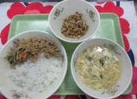 にしょくそぼろどん、ぐたくさんみそしる、こまつなとじゃこいため、牛乳です。