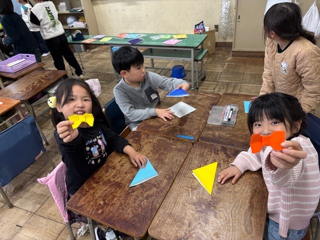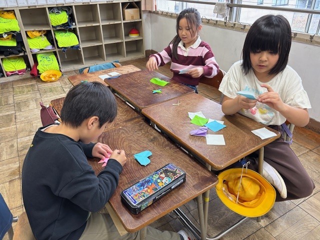 新しい1年生教室に飾る折り紙を折っていました。