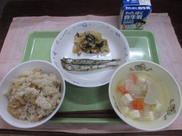 今日は、旬のたけのこで「たけのこごはん」をいただきました。