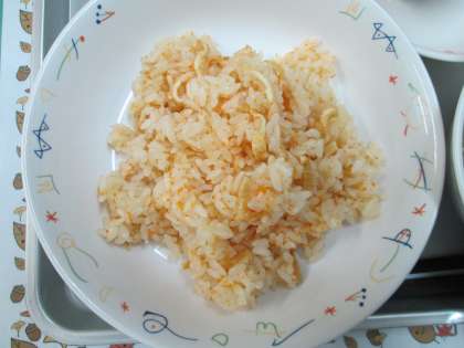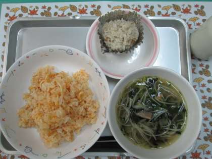 もみじごはんは、にんじんのすりおろしを、ごはんに炊き込んで作りました。紅葉のような色合いに見えたでしょうか?