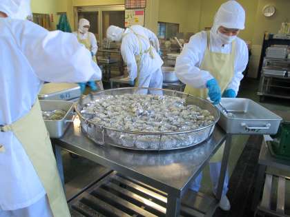 いがむしは肉団子にもち米をまぶし、栗のいがに見立てています。もち米のモチモチとした食感がアクセントになっておいしくできました。