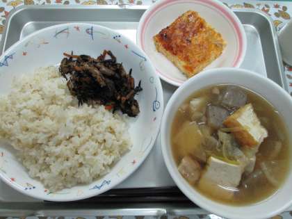 今日の給食は、むぎごはん 牛乳 ぎせいどうふ ひじきのにもの のっぺいじるです。