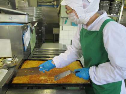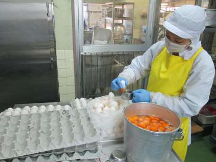 写真は、卵が傷んでいないか、殻が入らないか、一つづつ確認しながら割っているところと、焼きあがった卵焼きを切り分けているところです。