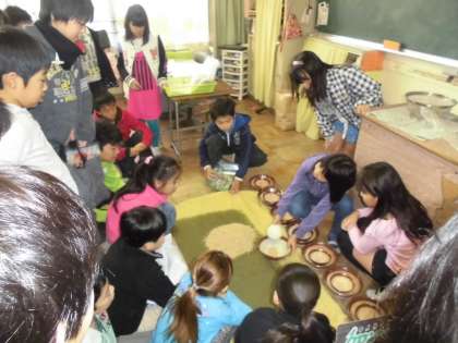 お米実行委員が籾すりのやり方をみんなに教えた後、みんなで実際に体験しました。