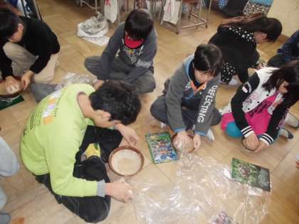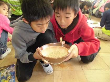 ソフトボールを上手にすり鉢とこすり合わせて、籾殻とお米に分けまる。そして、上手に息を吹きかけると、籾殻だけが舞い上がるので、その加減を上手に行っていました。