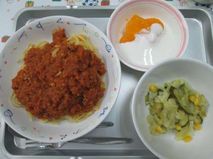 今日の給食は、スパゲティミートソース 牛乳 フレンチサラダ みかんヨーグルトです。