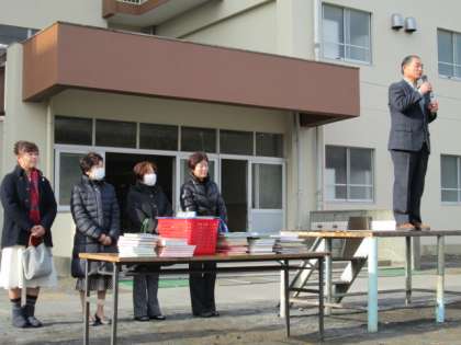 2月15日(月)全校朝会の時に、図書の寄贈をしていただきました。地域の「環境と資源を守る会」の皆さんがダンボールを回収した資金で図書を購入し、学校に届けてくださったものです。ありがとうございます。今月の生活目標は、「みんなで使うものを大切にしよう」です。新しい本、大切に、たくさん読んでほしいですね。