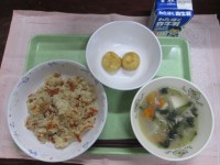 「今日は中秋の名月15夜にちなんで、お月見団子汁です。白玉団子にかぼちゃを練り込み、月に見たて、一つ一つ丁寧に丸めました。」