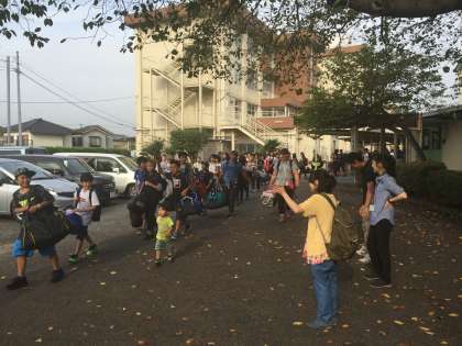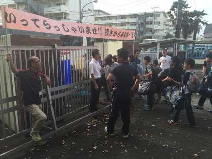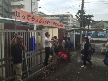見送りの先生方からの温かい手づくりの横断幕をくぐっての出発です。行ってきます。