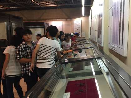 最初の見学地、さきたま古墳に到着しました。みんな元気です。まずは、教科書にも載っている国宝の鉄剣などを博物館で見学です。