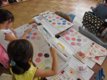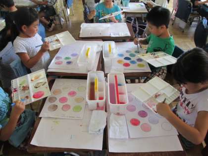 「いろいろなしゃぼん玉をつくろう!」ということで、初めての絵の具に挑戦しました。絵の具の使い方を学習し、赤・青・黄色の三色のみを使って自分だけの色を作りました。水の量や絵の具の量によって、できあがる色がちがうことを話したところ、パレットの上できれいな色をたくさん作ることができました。きれいな色でシャボン玉を塗ることができて大満足で笑顔がいっぱいの子どもたちでした。