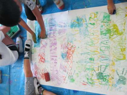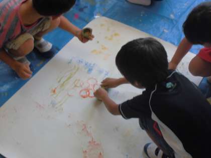 今週は、先週とは一味違う、絵の具を使った授業でした。緩衝材や毛糸を芯材に巻き付けてスタンプのように絵の具をつけて、模造紙に模様を写して楽しみました。模造紙に写る模様、絵の具の色の重なりなど、一つ一つに心が動かされた様子の子どもたちでした。最後は、「ここは、○○みたい!」「水色のこの模様が好き!」などと鑑賞もして、コロコロペッタンの世界にどっぷり浸かりました。