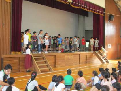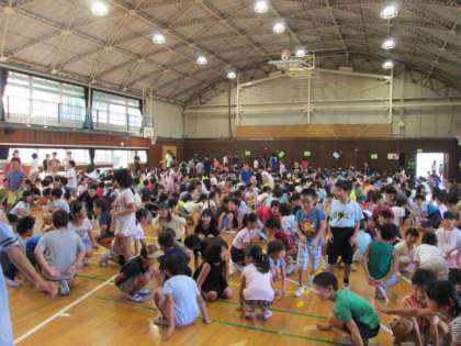 今日のゲーム集会は、集会委員のC班が企画してくれた進化ジャンケンでした。ジャンケンで勝つと、カエル→アヒル→クマ→人間の順に進化することができます。人間になると先生たちとジャンケンをすることができ、勝つとステージのに上がることができます。今日は、ステージの上にたくさんの子どもたちが上がり、とても盛り上がりました。