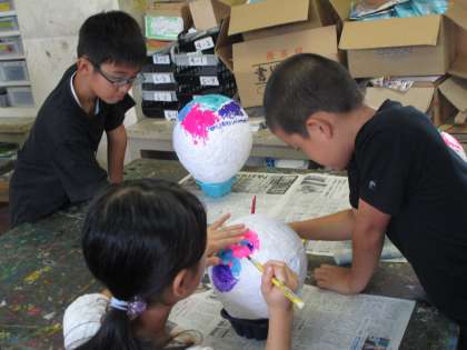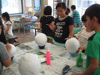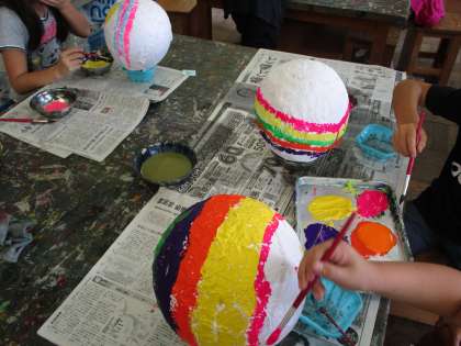 夏休み前の授業で風船を膨らませて和紙を貼り、張り子を作りました。