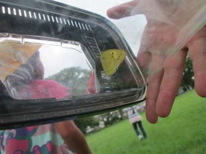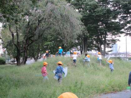天気が心配でしたが、曇り空の下、遺跡公園へ虫探しに出かけることができました。コオロギや、バッタ、トンボだけでなく、モンキチョウやシジミチョウなど多様な虫に出会うことができました。虫とり網を抱えて、チョウを追いかけたり、跳びはねるバッタをボウシでつかまえたり、歓声をあげながら、楽しく虫を捕まえました。虫かごや虫捕り網、水筒の御準備をありがとうございました。