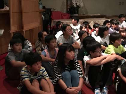 奥日光は午後6時くらいから雨になりました。そこでキャンプファイヤーは明日に延期となりました。急遽、館内でナイトハイクとなりました。写真は出発前の怖い話を聞いているところです。