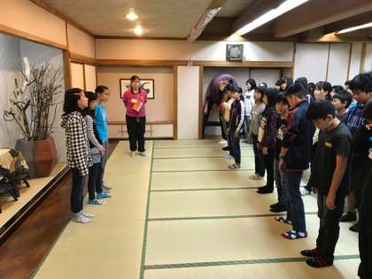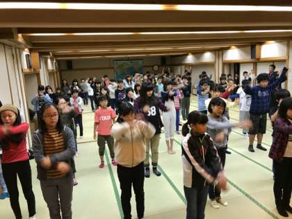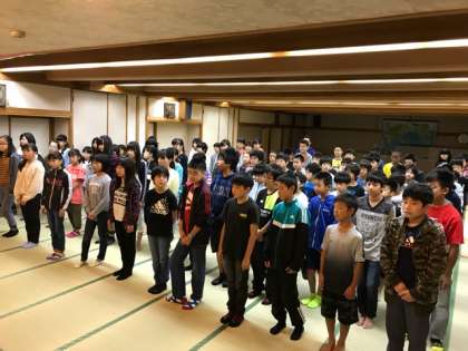 朝の会です。雨天のため、湯の湖畔ではなく、大広間での会となりました。明日が晴天ということでハイキングは明日実施となりました。今日は3日目の行程で活動します。
