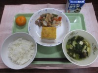 ☆献立名☆ 赤米ごはん さわらの照り焼き たけのこのきんぴら 端午のすまし汁 果物 牛乳