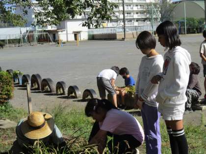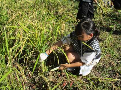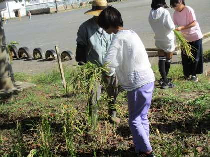 稲はしばらくの間、職員室前のテラスに干しておきます。