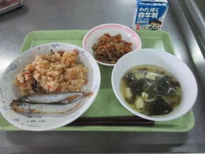 今日は、旬のたけのこをつかった、ちまき風たけのこごはんです。
